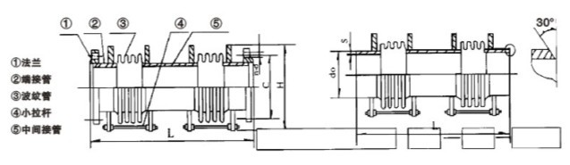JXH型小拉桿橫向波紋補償器,由兩段波紋管,中間接管及帶有限位螺母的小拉桿等零件組成。小拉桿不能承受內壓推理。JXH型小拉桿橫向波紋補償器可以補償彎曲管段的橫向位移和角項位移,同時可以補償軸向位移。JXH型小拉桿橫向波紋補償器安裝完后,務必將小拉桿上的落幕松開并離開耳片一段距離。